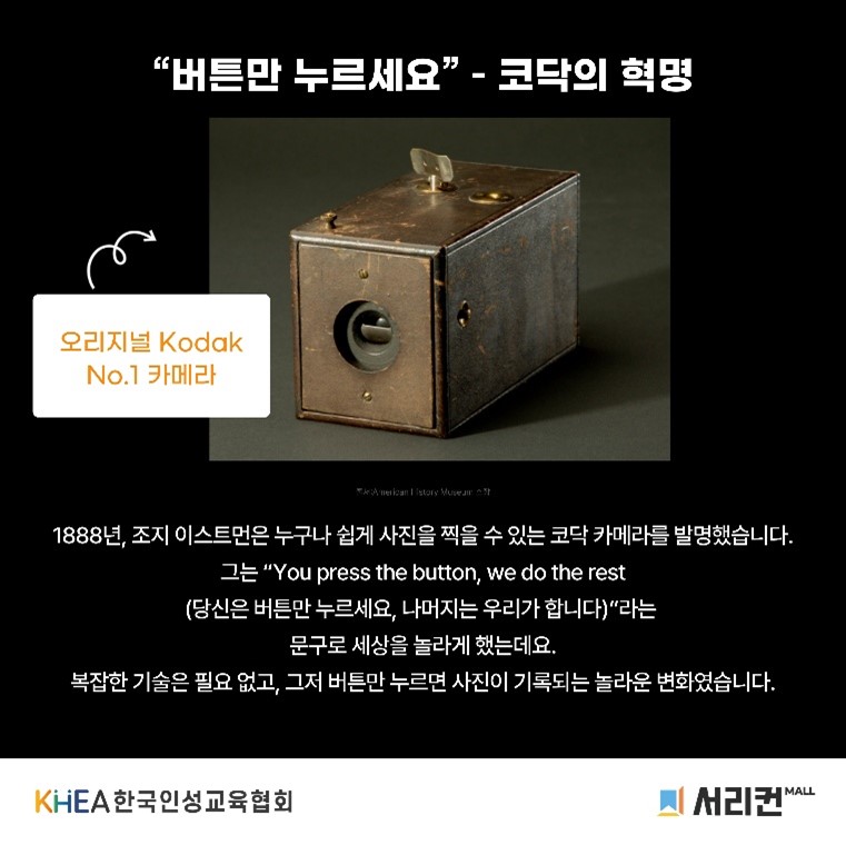 수업은 가볍게 시작하는 것이 좋습니다. 먼저 코닥 카메라 이야기와 광고 문구 “버튼만 누르세요. 나머지는 우리가 합니다.”가 담긴 카드뉴스를 보여주세요.