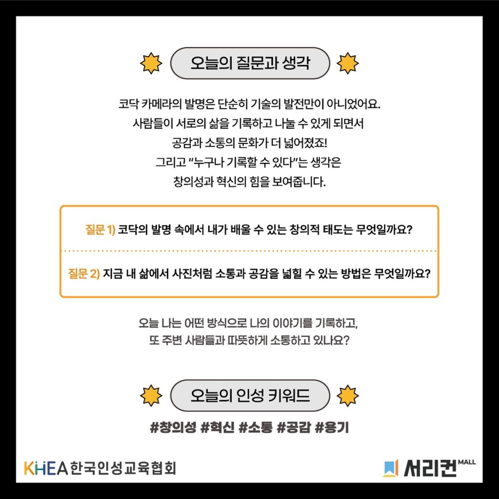 이번 글에서는 코닥 카메라를 주제로 한 카드뉴스를 통해 그 혁신의 의미를 교실 속 수업으로 연결하는 방법을 소개합니다. 단순히 기술사를 배우는 데 그치지 않고, 학생들이 ‘기록의 힘’과 ‘공유의 가치’를 체험할 수 있는 창의적 활동으로 확장할 수 있습니다.