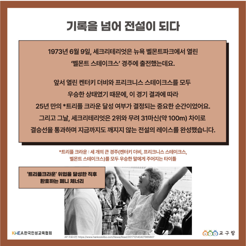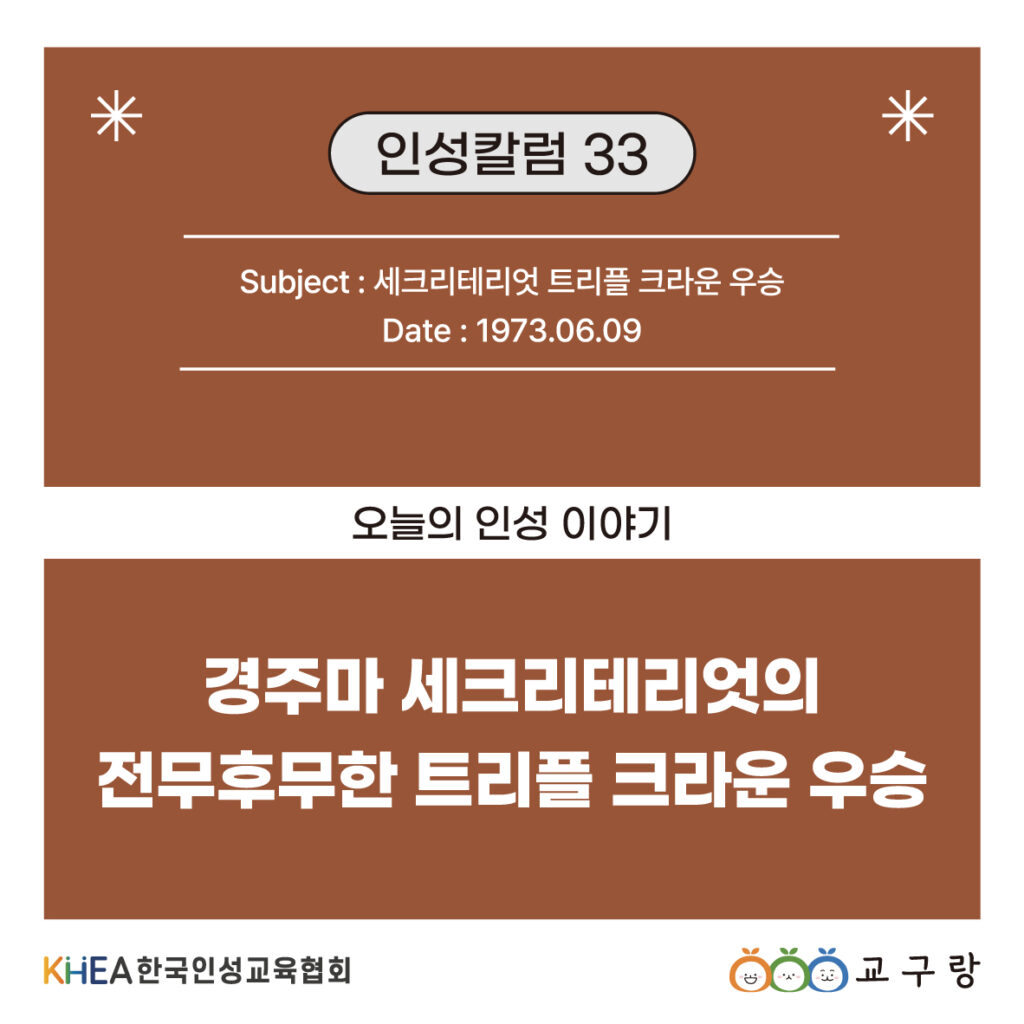 결국 세크리테리엇은 1973년, 25년 만의 트리플 크라운을 달성하며 전설이 되었습니다! 🏆🥇