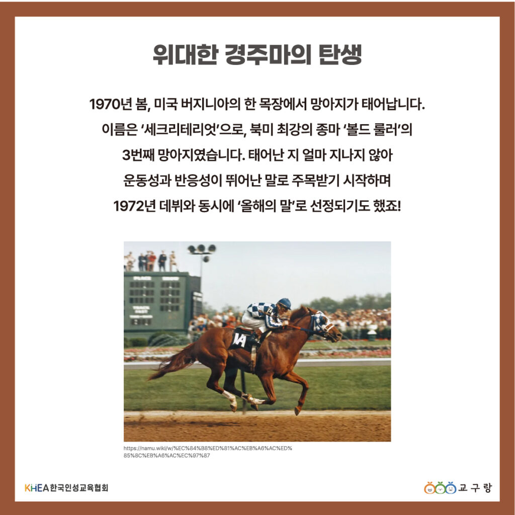 1970년 미국 버지니아의 한 목장에서 태어난 ‘세크리테리엇’은 전설적인 경주마입니다. 🐎✨