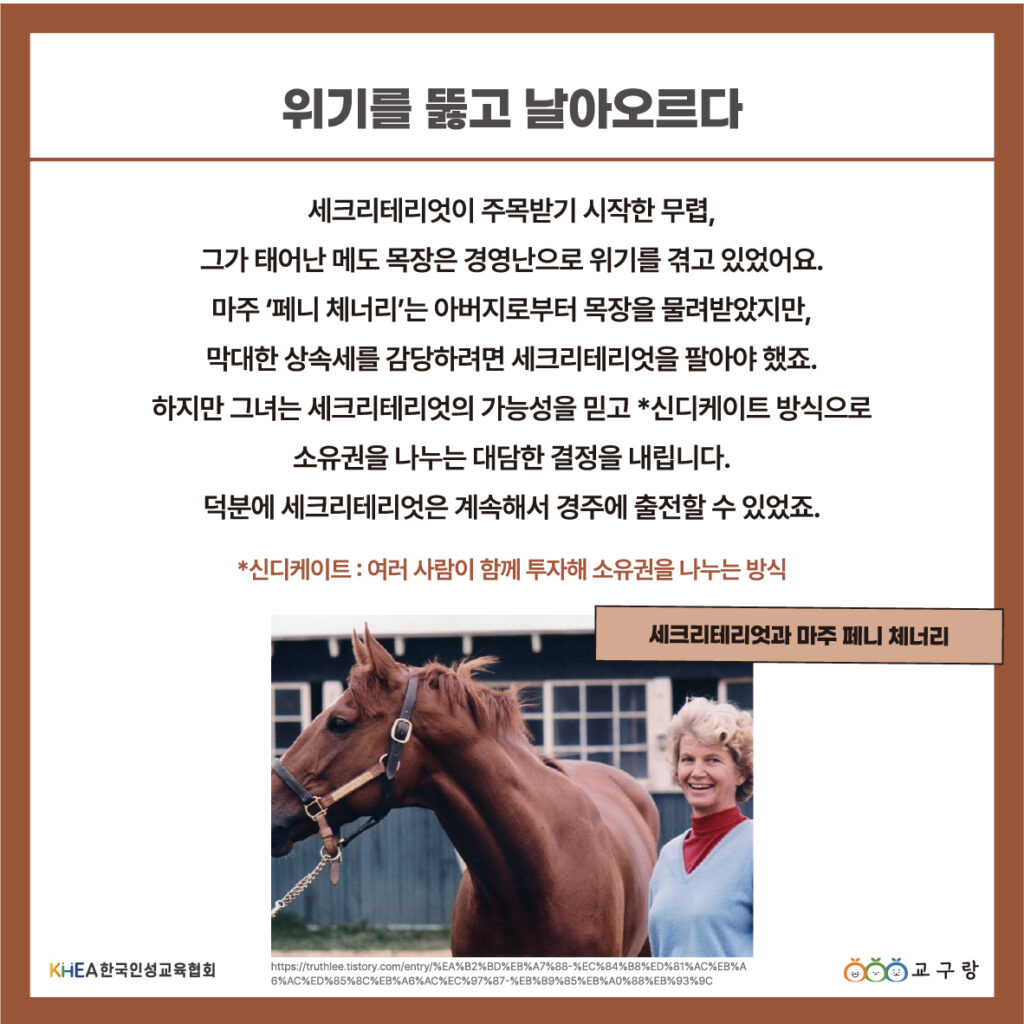 그럼에도 그녀는 세크리테리엇의 잠재력을 믿고, 소유권을 나누는 ‘신디케이트’라는 대담한 결정을 내립니다.