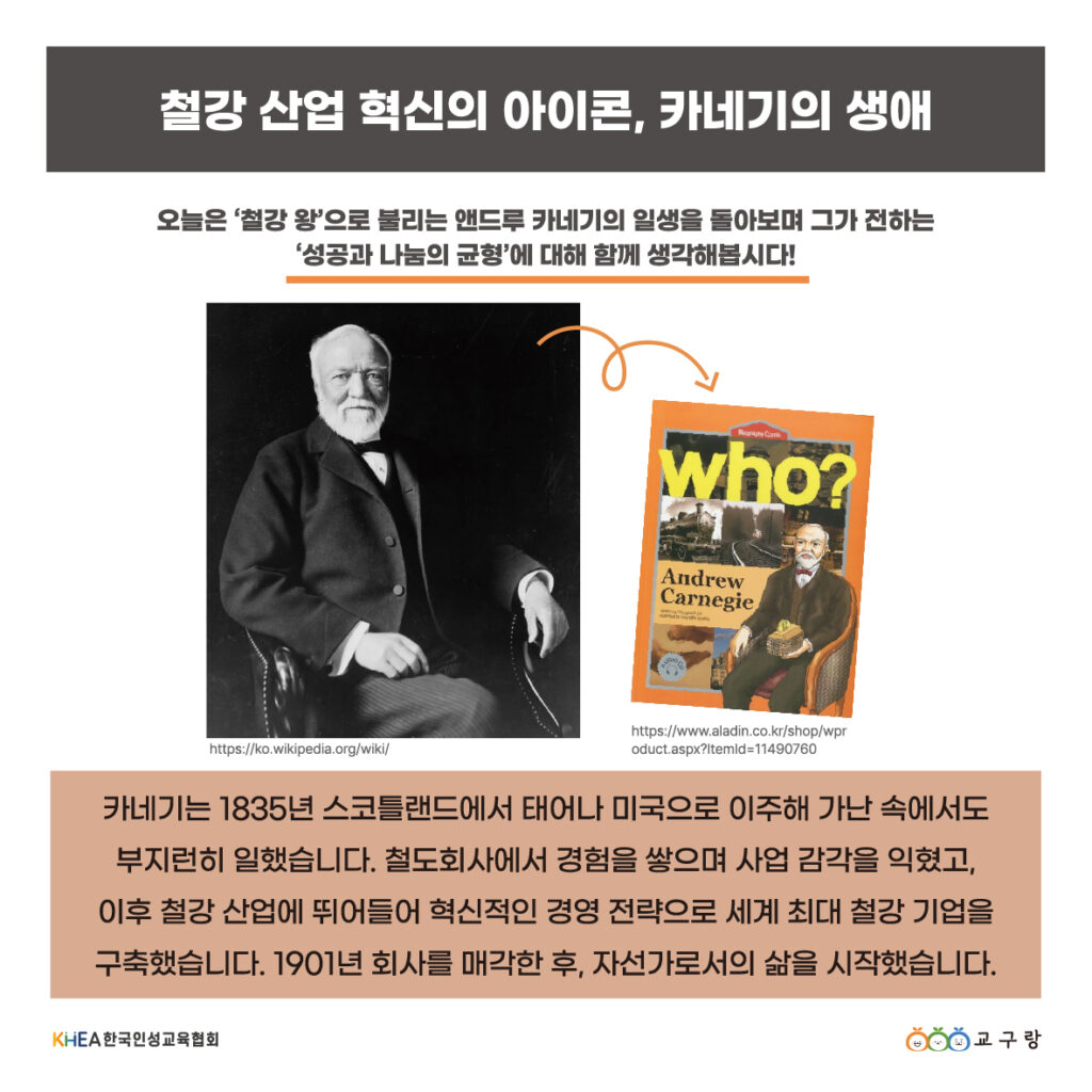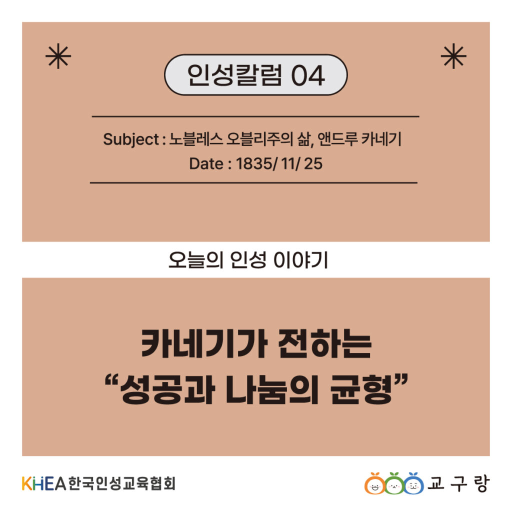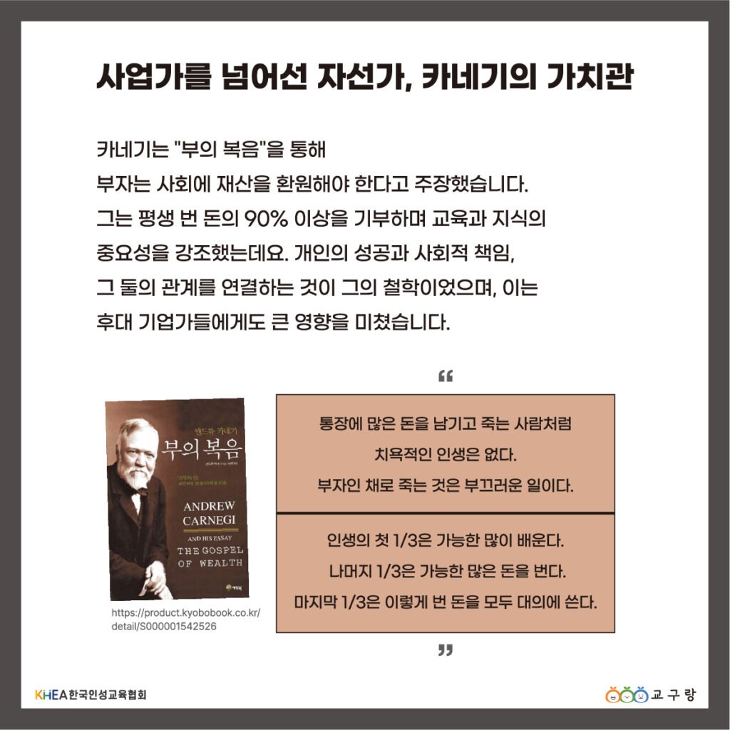 “오늘의 인성 이야기” Subject : 노블레스 오블리주의 삶, 앤드루 카네기 Date : 1835년 11월 25일 [앤드루 카네기 출생] 자신이 축적한 많은 재산을 사회에 환원한 철강 왕 카네기! 오늘 인성칼럼을 통해 노블레스 오블리주를 실천한 카네기의 삶을 들여다보고, 그에게 정말로 중요했던 가치가 무엇인지 함께 생각해보면 좋겠습니다-! 링크가 복사되었습니다.