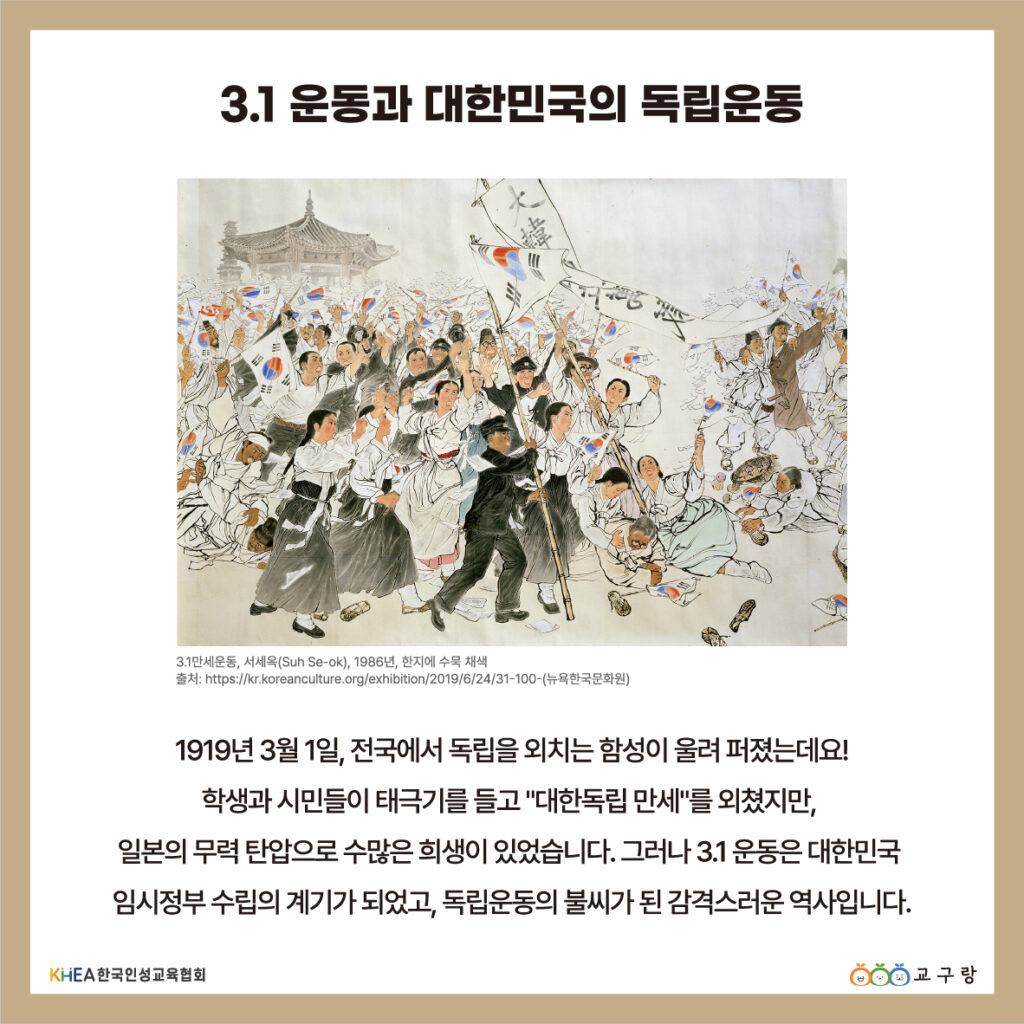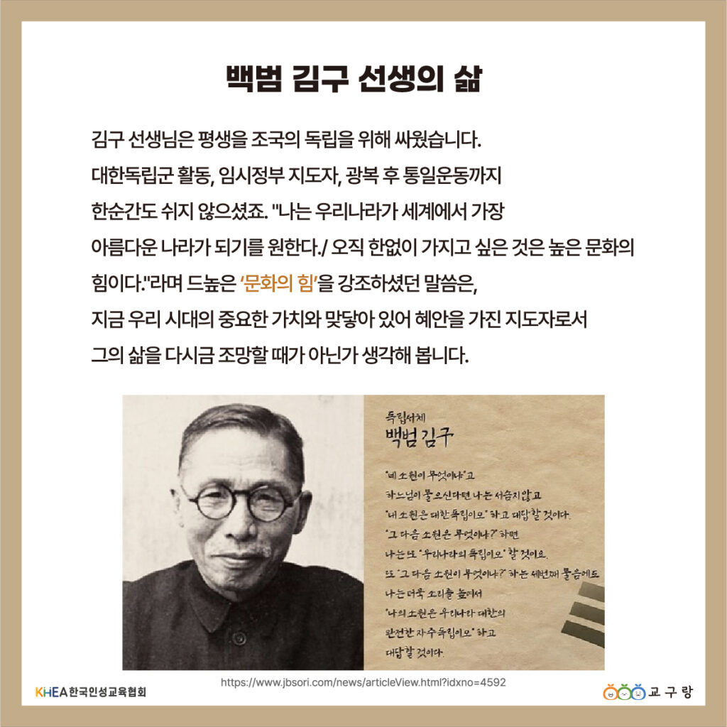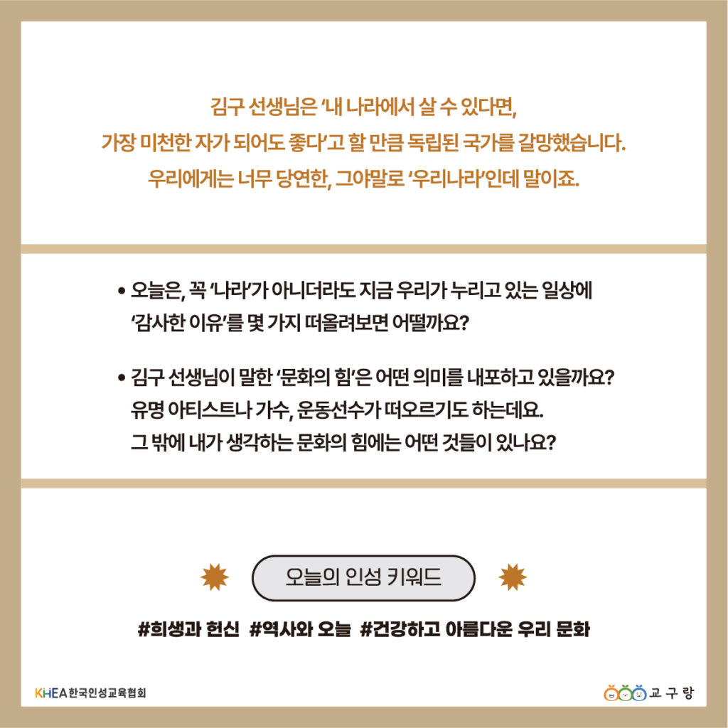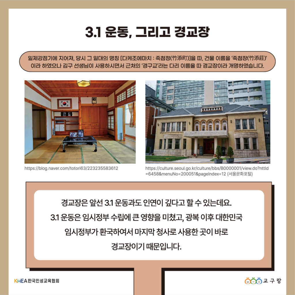 “오늘의 인성 이야기” Subject: 장소와 인물로 바라보는 독립 투쟁의 역사 Date: 1919.03.01 우리가 평화로운 ‘오늘’을 맞이할 수 있는 이유는 바로, 선열들의 희생과 궂은 의지 덕분이 아닐까요? 오늘은 ‘경교장’이라는 장소를 중심으로 김구 선생님과 3.1운동의 역사를 되짚어보고자 합니다. 인성칼럼과 함께 오늘에 감사할 수 있는 이유를 발견해 보신다면 좋겠습니다 🙂 링크가 복사되었습니다.