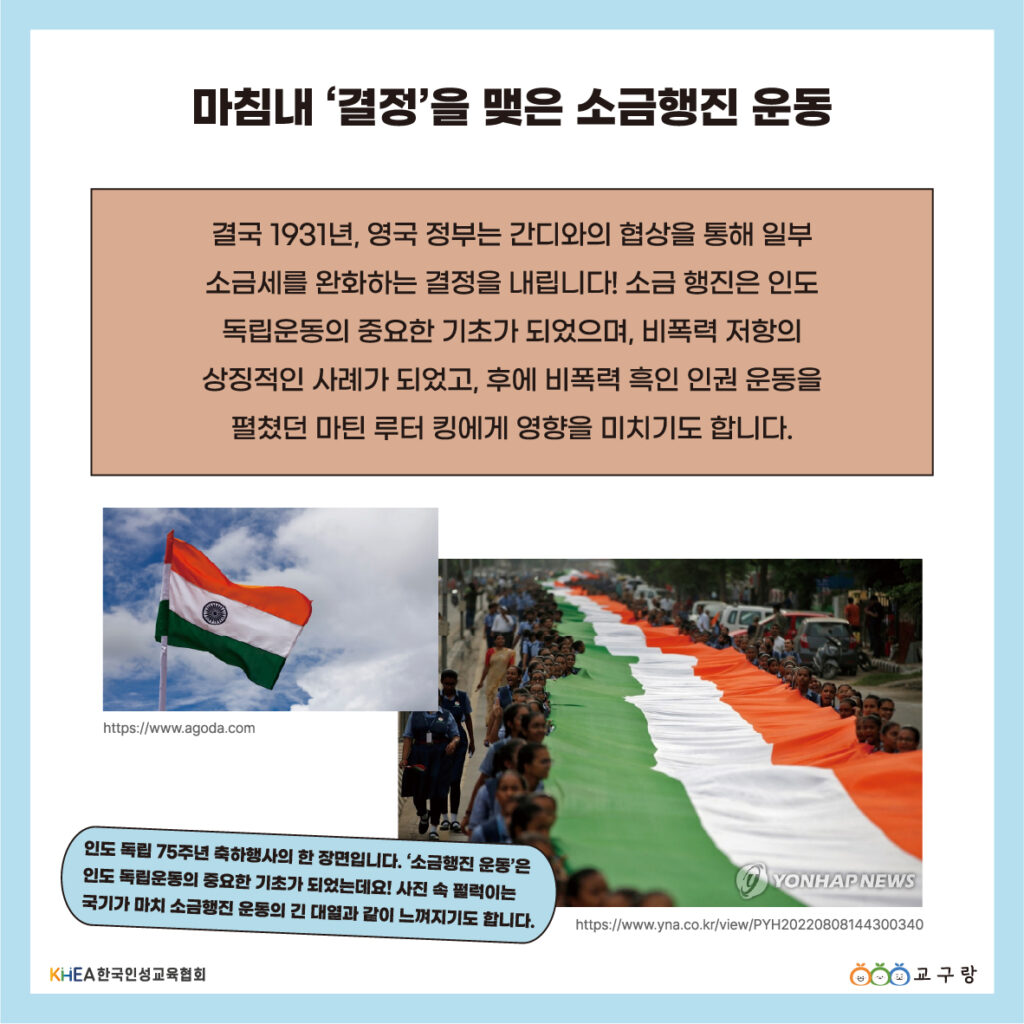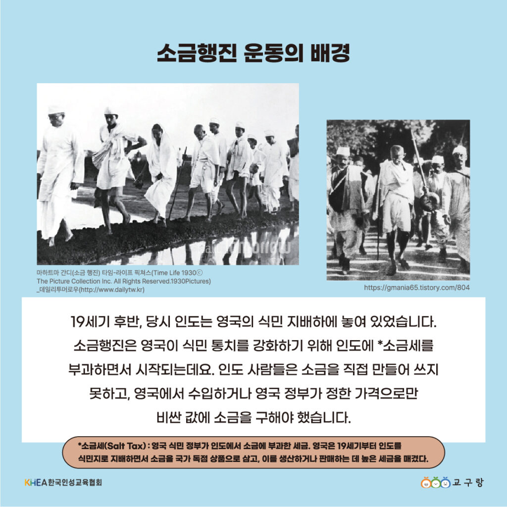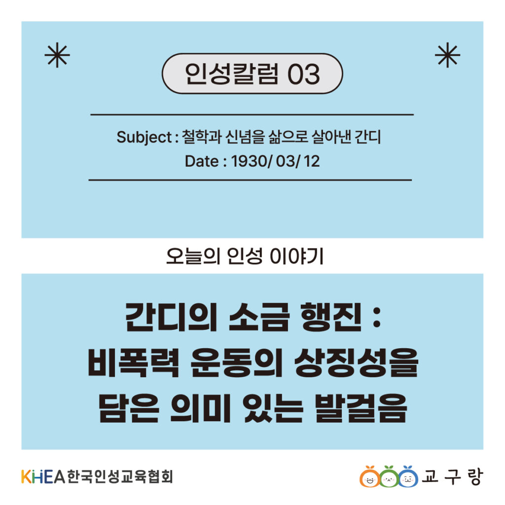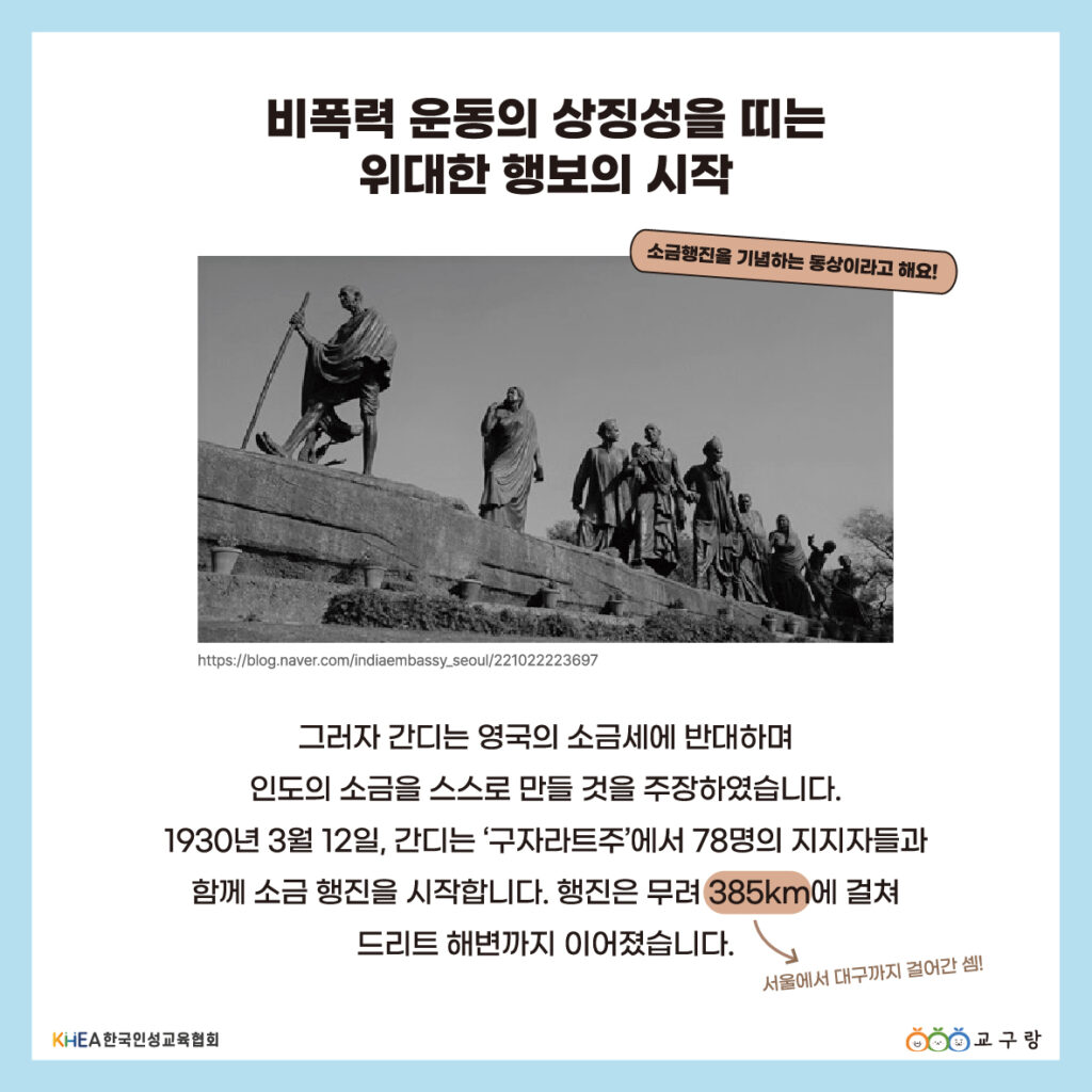 “오늘의 인성 이야기” Subject: 철학과 신념을 삶으로 살아낸 간디 Date: 1930.3.12 [소금 행진 시작] 자신의 생각과 신념대로 행동하기란 참 쉽지 않은데요. 오늘은 자신의 철학과 신념을 삶으로 살아내며, 평화적인 방법으로 변화를 이끌어간 ‘간디’의 소금행진 사건에 대해 알아보겠습니다🙂 링크가 복사되었습니다.