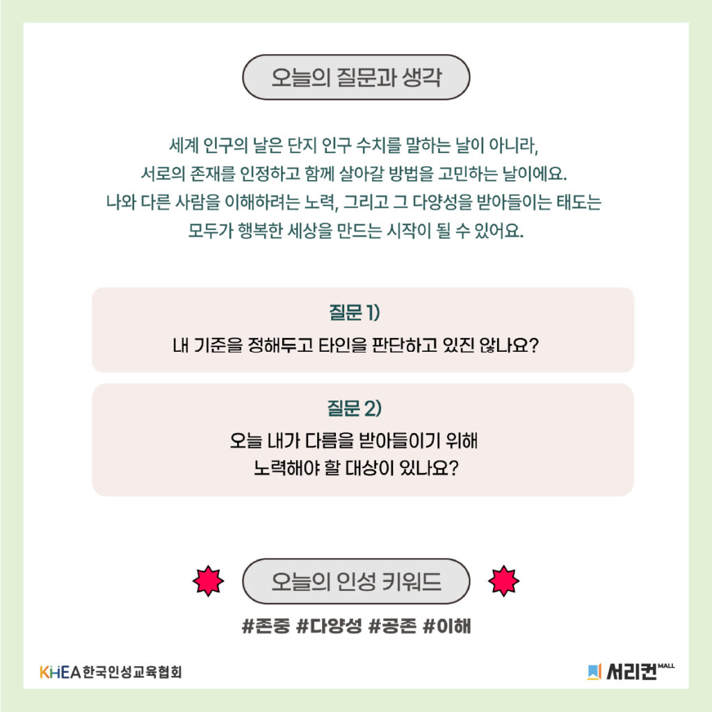 타인을 내 기준에 맞춰 판단하기보다, ‘존중’과 ‘이해’의 마음으로 모두가 행복한 세상을 만드는 발걸음에 동참해 주세요💗✨