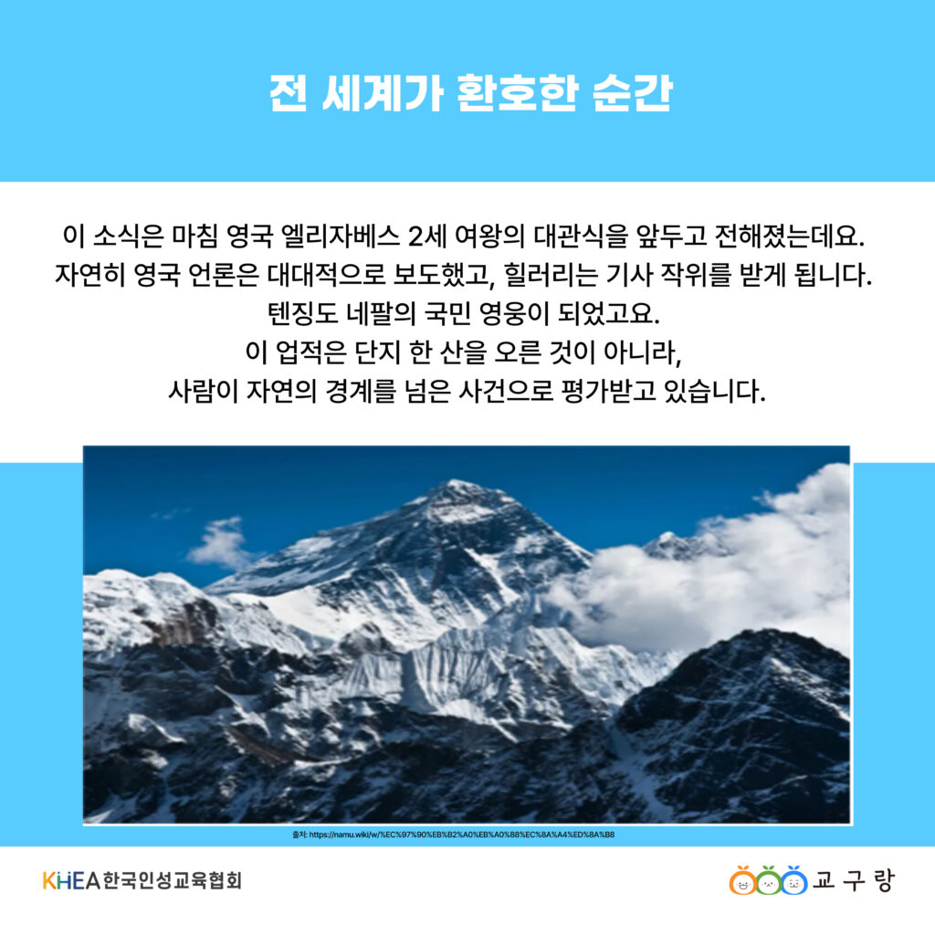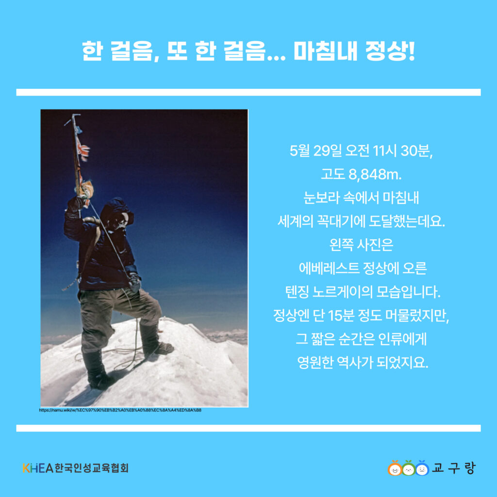 인류 역사상 최초로 에베레스트 정상(해발 8,848m)에 올랐습니다. 🏔️