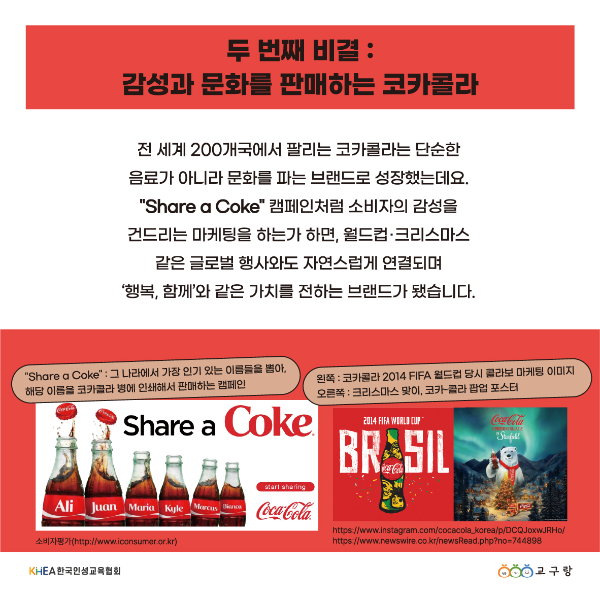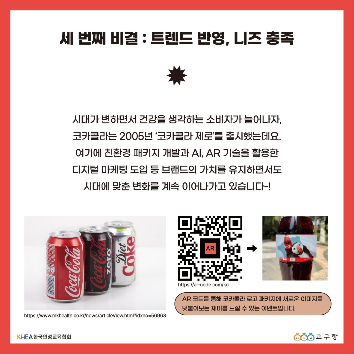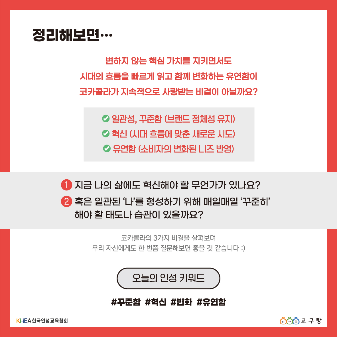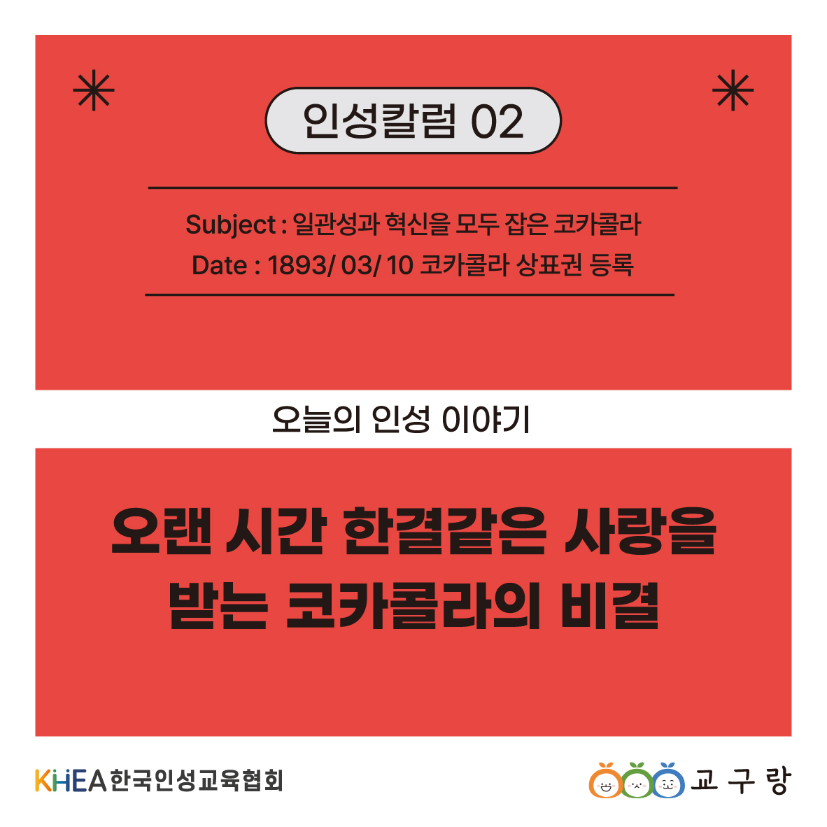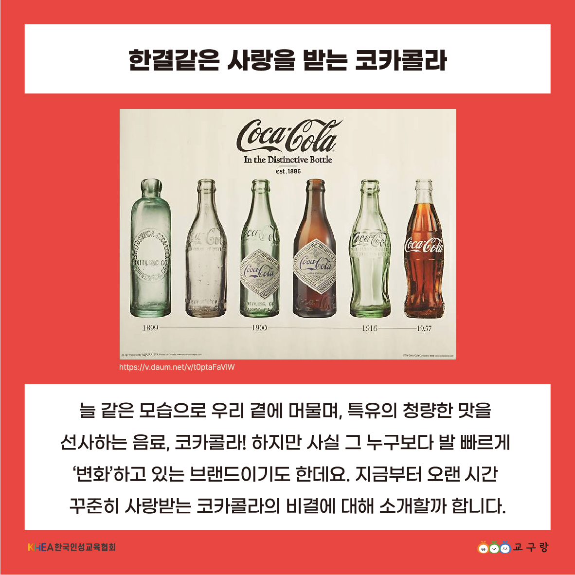 “오늘의 인성 이야기” Subject: 일관성과 혁신을 모두 잡은 코카콜라 Date: 1893.3.10 [코카콜라 상표권 등록일] 변하지 않는 핵심 가치를 지키면서, 동시에 시대의 흐름을 읽고 유연하게 변화하는 코카콜라! 오랜 시간 사랑 받는 코카콜라의 비결과 함께, 오늘의 인성 이야기를 전합니다 🙂 링크가 복사되었습니다.