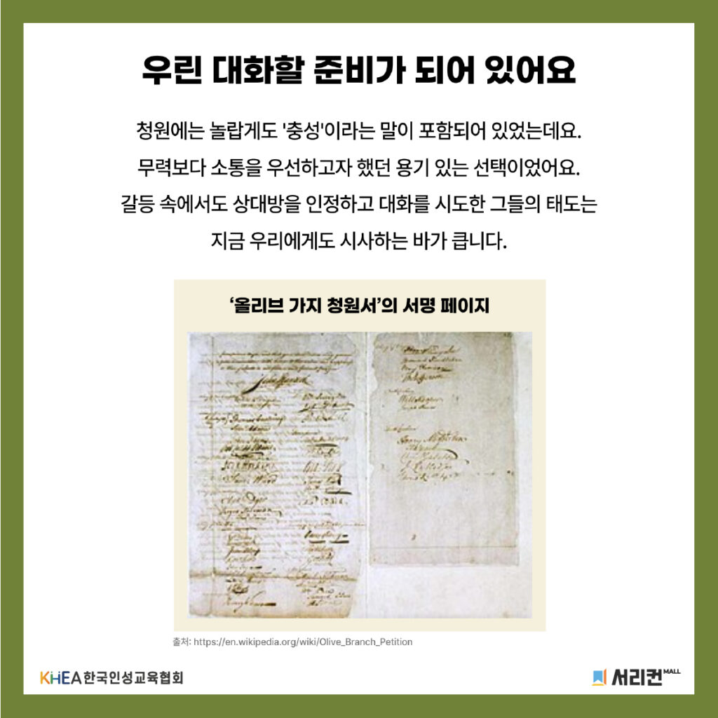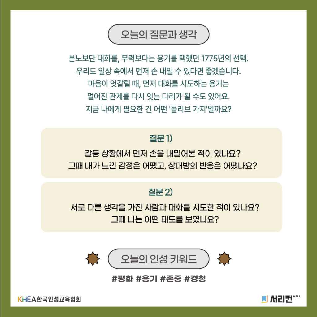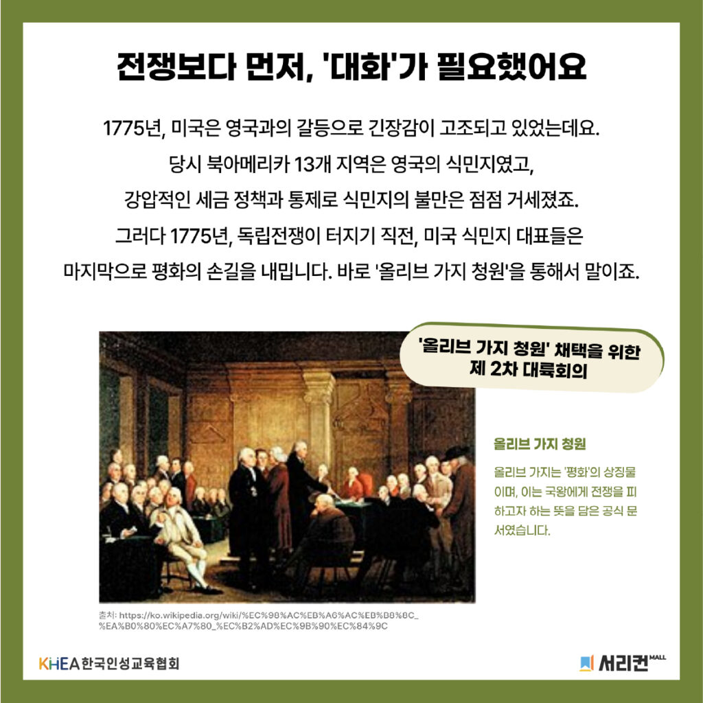 1775년, 미국 식민지 대표들이 독립 전쟁 직전 ‘올리브 가지 청원’을 내민 것은 분노 대신 대화와 소통을 우선하고자 했던 역사적인 용기였어요! 💪