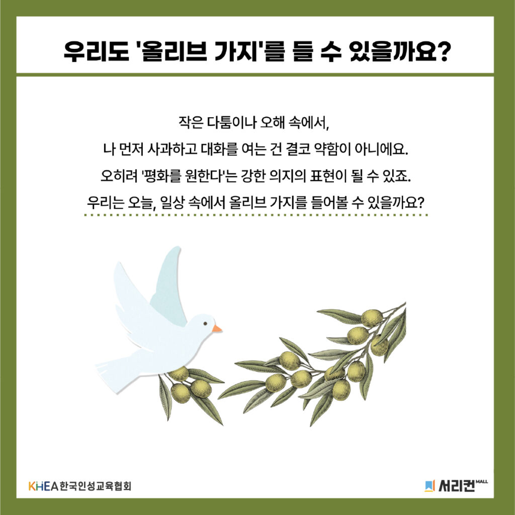 우리도 일상에서 먼저 손 내밀 용기를 낸다면, 무너진 관계를 다시 잇는 다리가 될 수 있어요! 지금 나에게 필요한 올리브 가지는 무엇인지 함께 생각해 봅시다. 🙏