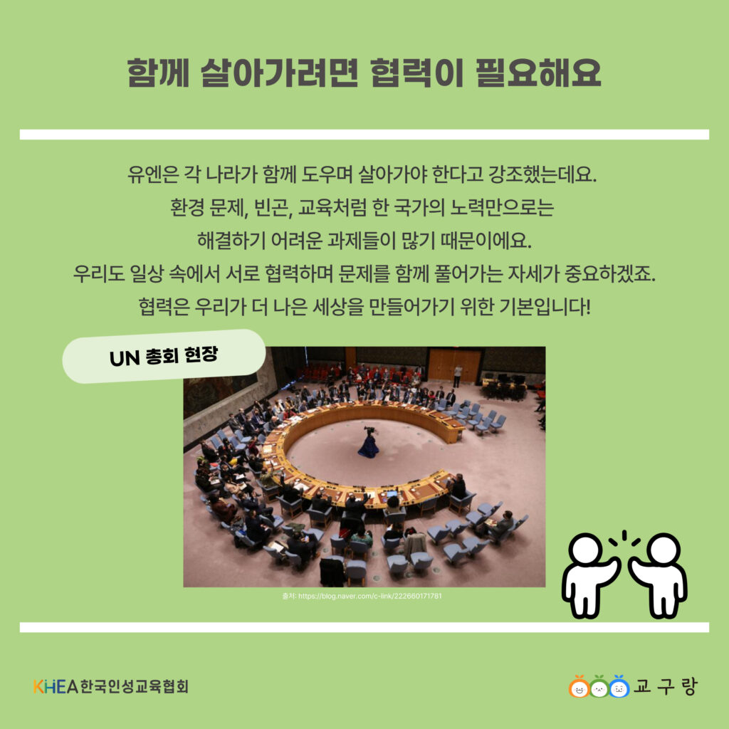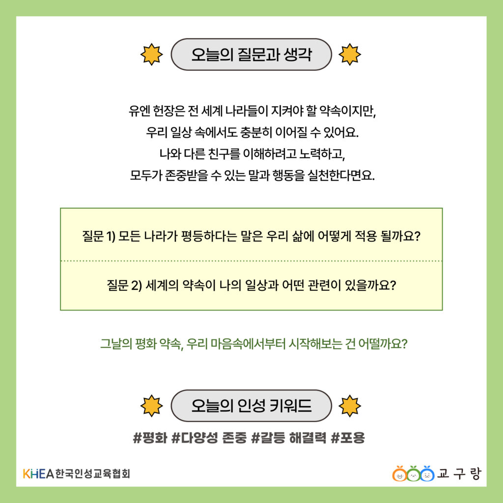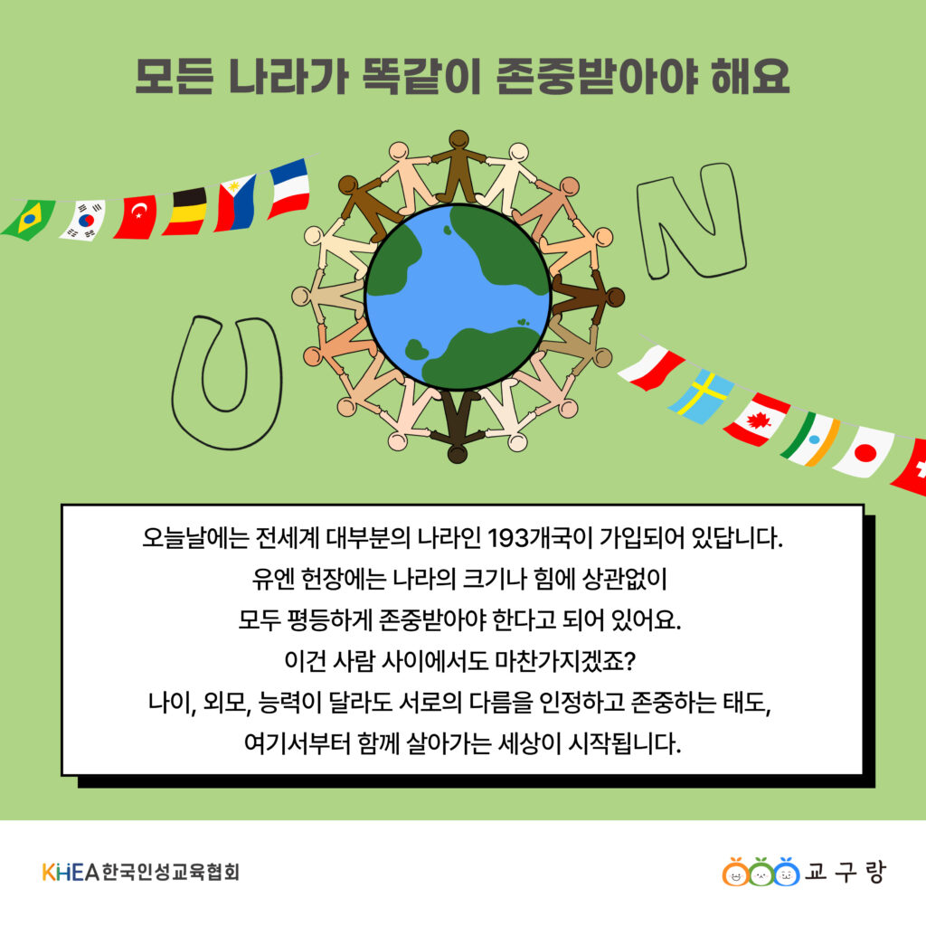 UN 헌장의 정신은 우리가 일상 속에서 서로의 다름을 인정하고 존중하려는 태도에서부터 시작됩니다.💚