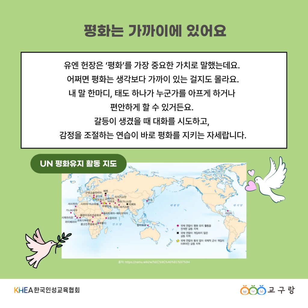 중요한 것은 이 약속이 멀리 있는 것이 아니라는 점입니다. 나의 말 한마디, 행동 하나가 평화를 만들 수 있듯,