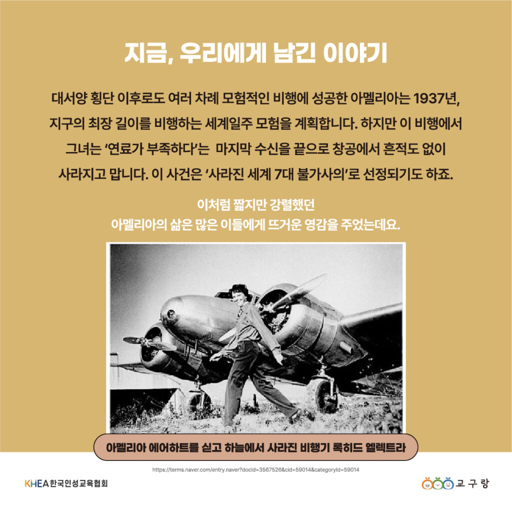 하지만 1937년, 세계 일주 도전 비행 중 “연료가 부족하다”는 마지막 교신을 끝으로 실종되며
