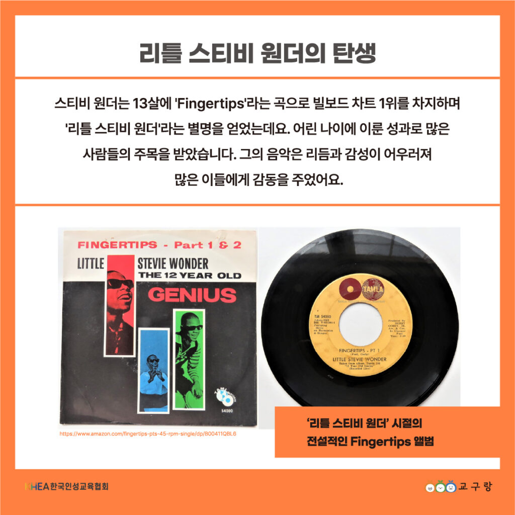 13살이 되던 무렵에는 ‘Fingertips’로 빌보드 차트 1위를 차지하며 ‘리틀 스티비 원더’로 불렸죠.