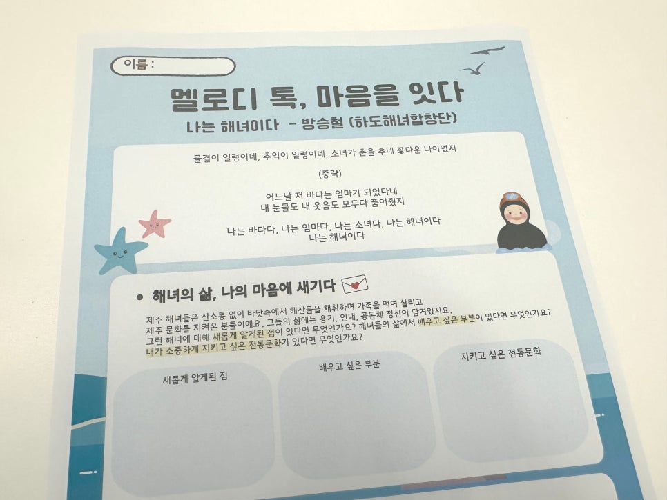 해녀 문화와 우리나라의 전통문화에 대해 조사하는 시간을 가진다면